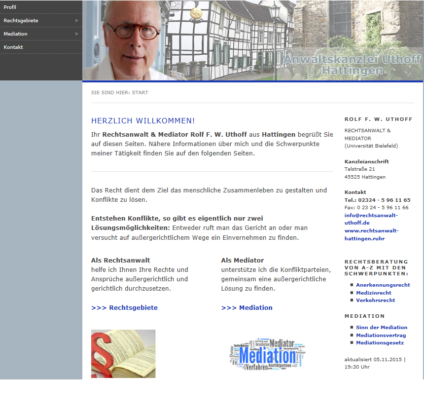 Die Anwaltskanzlei Rolf. F. W. Uthoff aus Hattingen beauftragte uns mit der Erstellung einer Webseite. Der Rechtsanwalt und Mediator Rolf Uthoff aus Hattingen hat besondere Erfahrungen in den Rechtsgebieten Anerkennungsrecht, Medizinrecht und Verkehrsrecht.