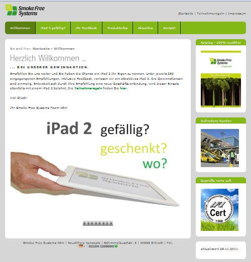 Die nordrheinwestfälische Tochter des schwedischen Systemanbieters für Nichtraucherschutz Smoke Free Systems bietet seinen Kunden für Weiterempfehlungen Gewinnchancen auf ein nagelneues ipad 2.