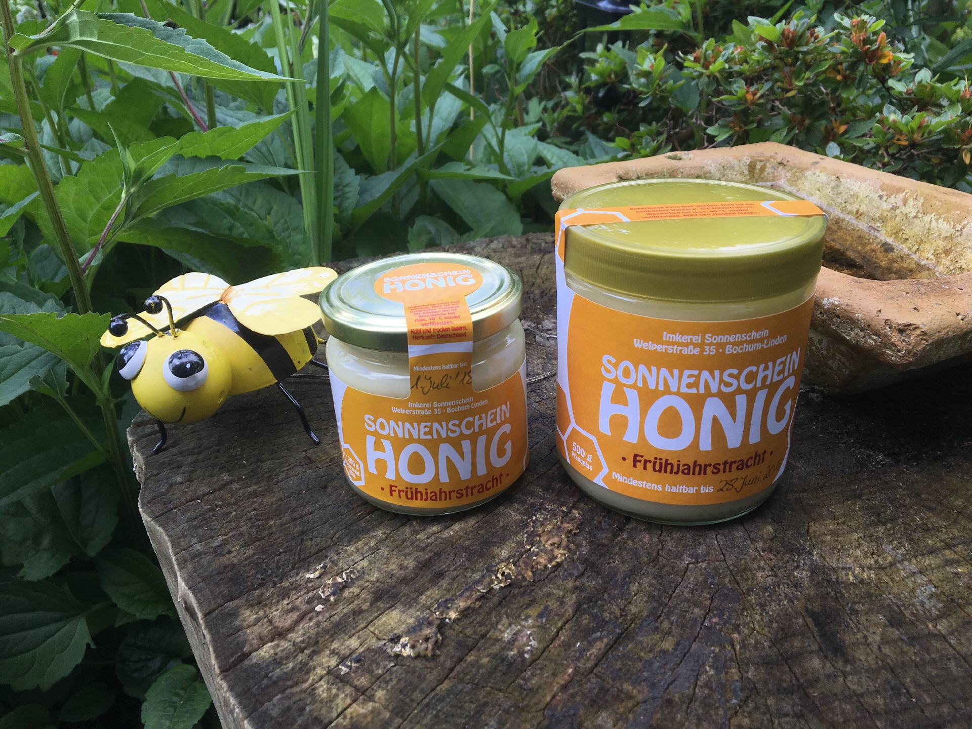 Unseren eigenen Honig aus Bochum der Marke "SONNENSCHEIN HONIG" gibt es in den Sorten "SONNENSCHEIN HONIG"-Frühjahrstracht und "SONNENSCHEIN HONIG"-Sommertracht.